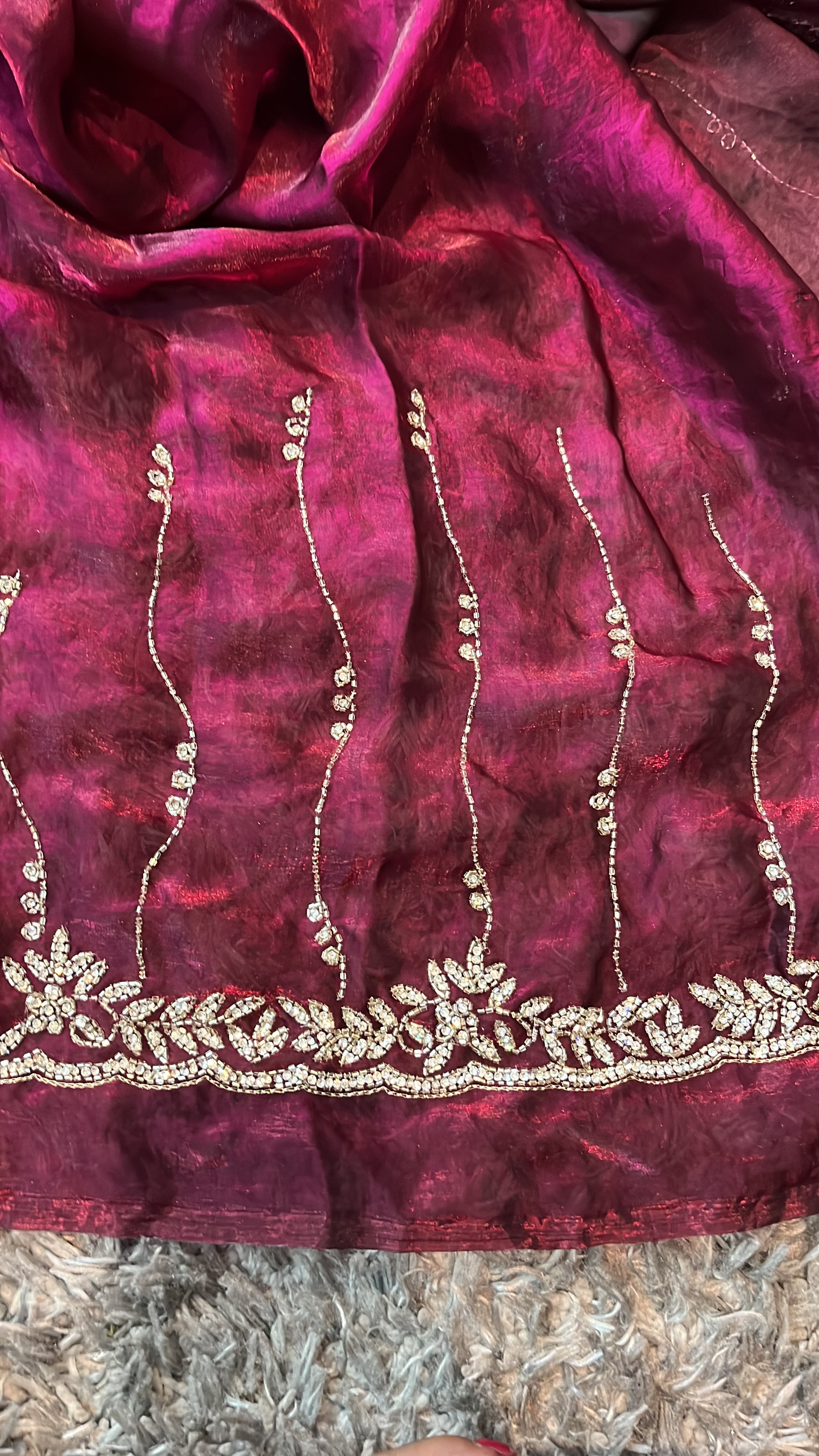 Elevate your festive wardrobe with the Chandni Velvet Satin Saree, a masterpiece of timeless grace and modern allure. Crafted from luxurious fendy satin with a soft, velvet-like sheen, this saree drapes effortlessly to create a look that’s both sophisticated and striking. The sleek, hand-finished “slick” border adds a touch of structured elegance, making it perfect for evening events, weddings, or any special celebration.