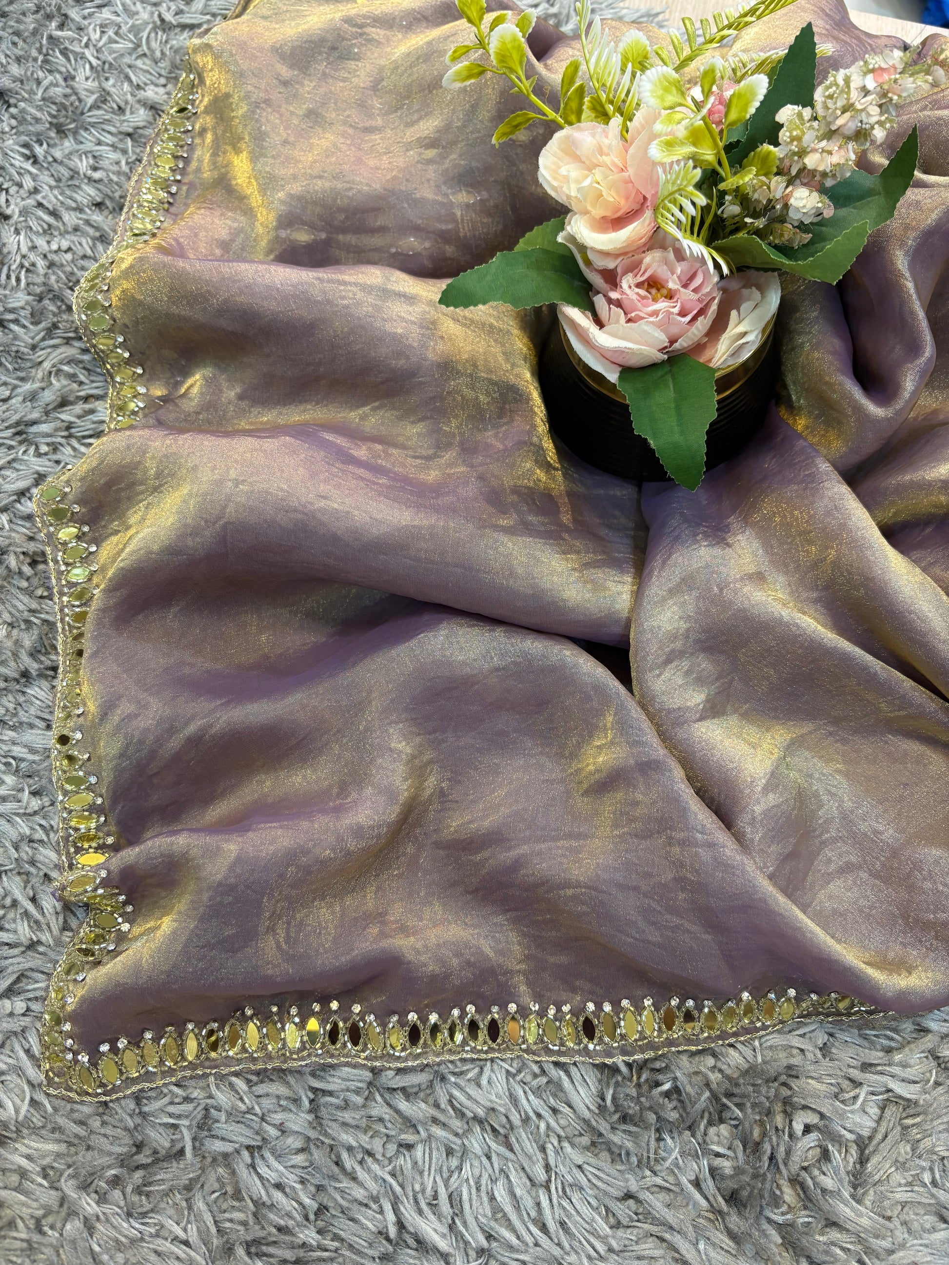 The highlight of this masterpiece lies in its hand-embellished border, featuring real mirrors, delicate cutdana, and sparkling zircon stones – all intricately worked to add a royal charm and unmatched brilliance. Whether it’s a wedding celebration, festive occasion, or an elegant evening event, this saree ensures you stand out effortlessly.
