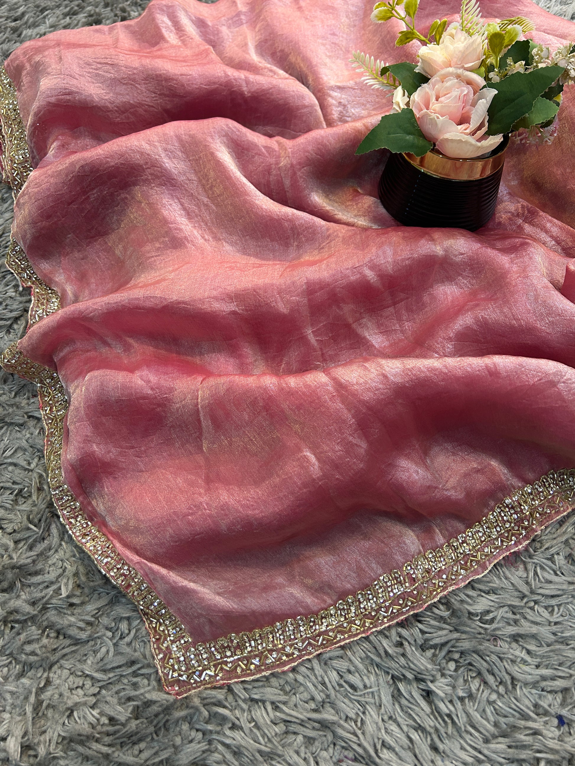 Embrace timeless elegance with the Meera Velvet Satin Saree, a perfect blend of tradition and luxury. Crafted from rich velvet satin fabric, this saree offers a smooth, lustrous drape that exudes sophistication. The exquisite hand embroidery featuring cutdana and zardosi work adds a royal charm, making it an ideal choice for weddings, receptions, festive occasions, or elegant evening gatherings.