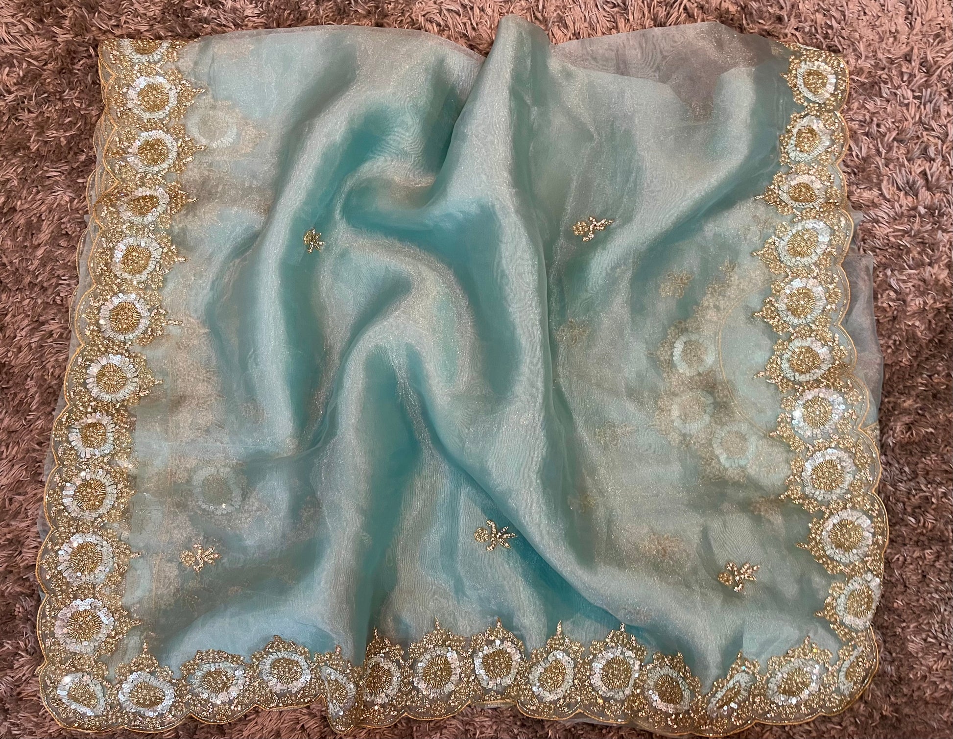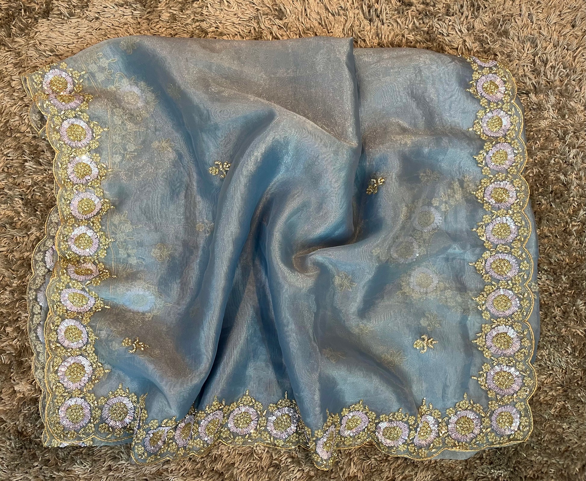 Fabric & texture: The base combines tissue’s light shimmer with organza’s delicate crispness, creating a saree that drapes effortlessly yet holds its shape with poise.