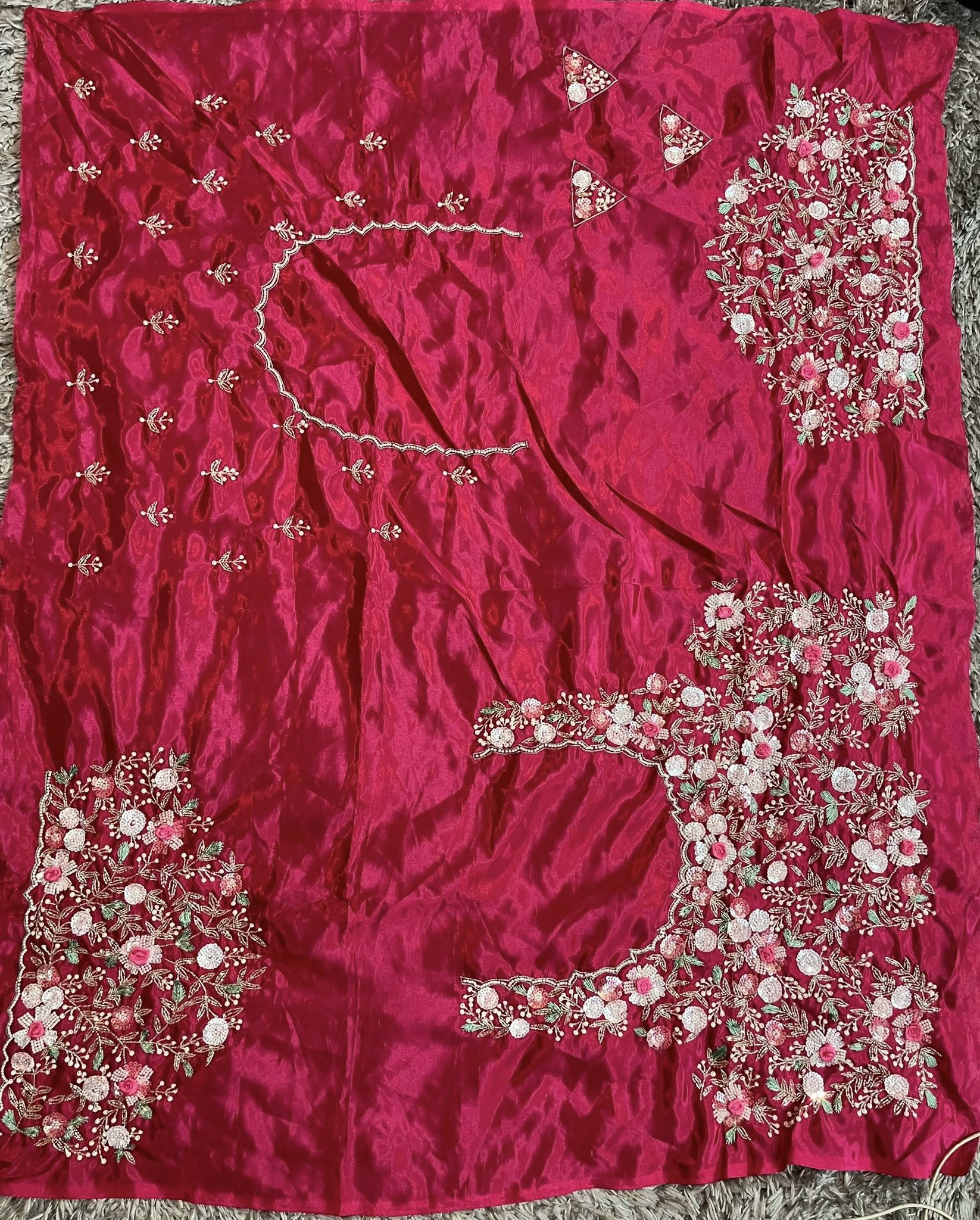 The saree features exclusive handwork detailing, meticulously done by skilled artisans, making it a true statement of craftsmanship and luxury. Paired with a heavy designer blouse piece, it creates a rich and festive look ideal for weddings, receptions, and grand celebrations.