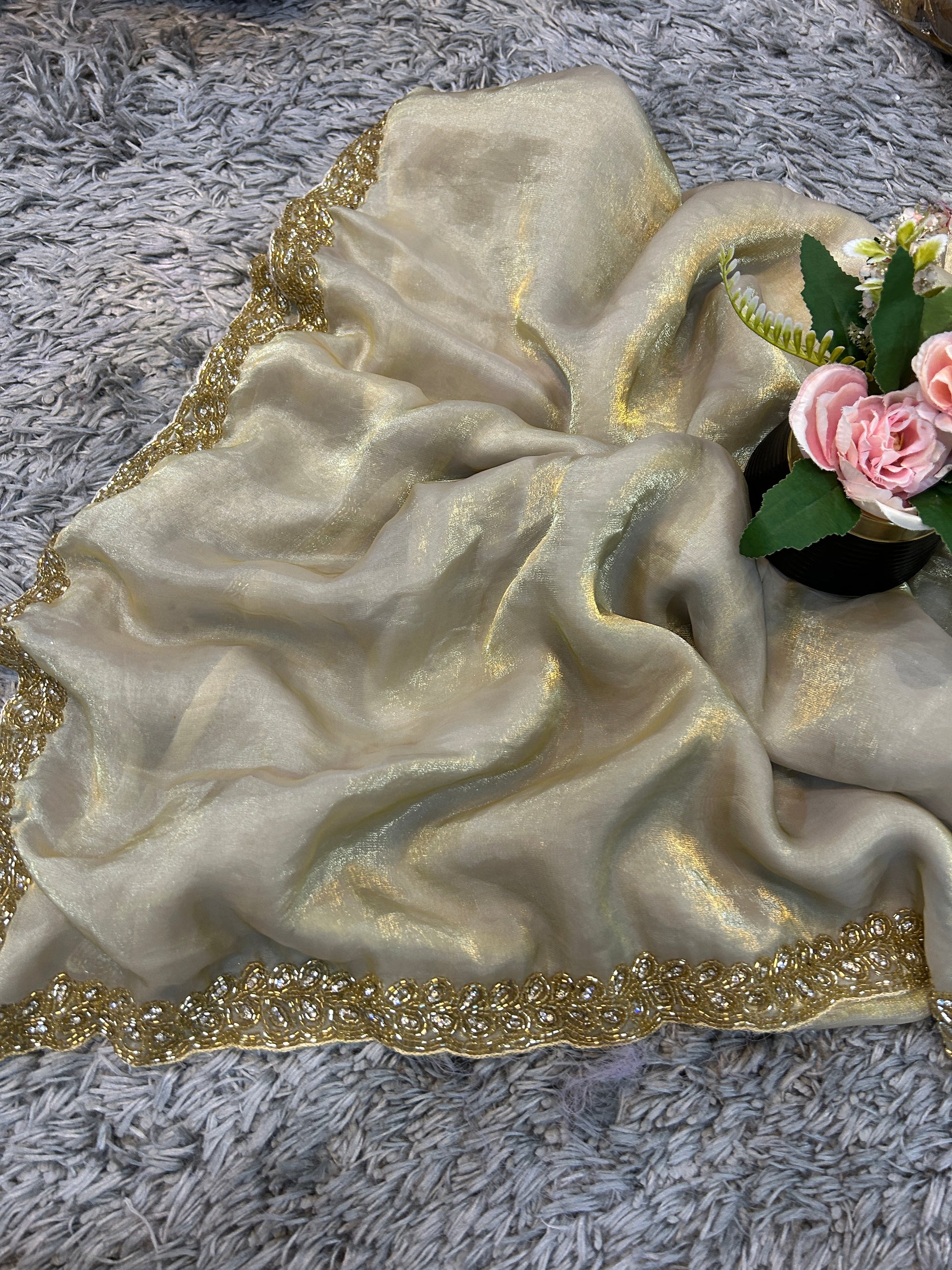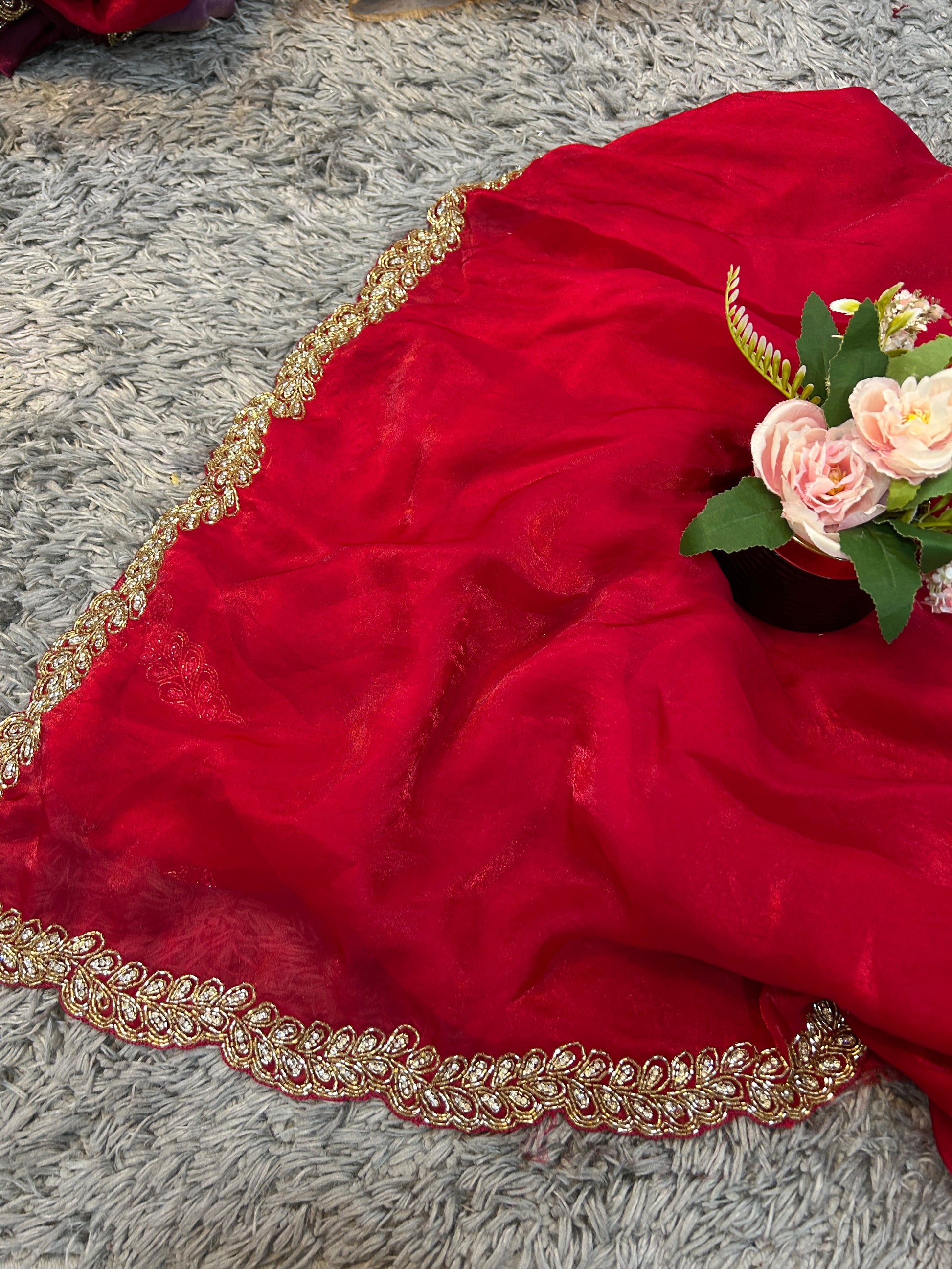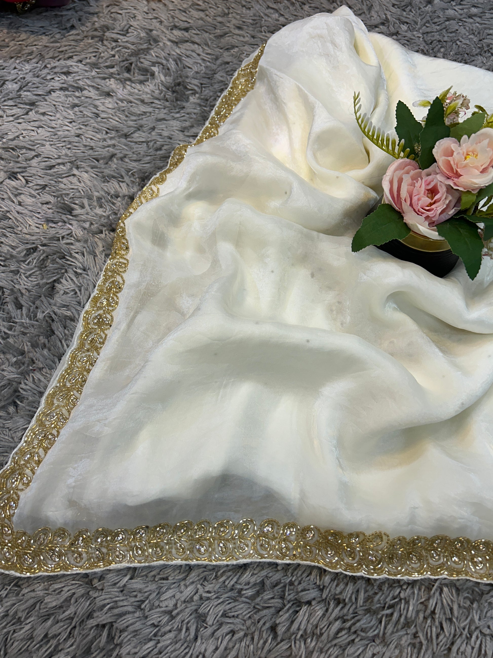 Elevate your poise and presence with this exquisite creation — a perfect marriage of sumptuous texture and luminous elegance. Crafted in luxurious velvet satin, this saree offers the rich plushness of velvet with the subtle sheen of satin, resulting in a fabric that drapes beautifully and catches light with refined grace.